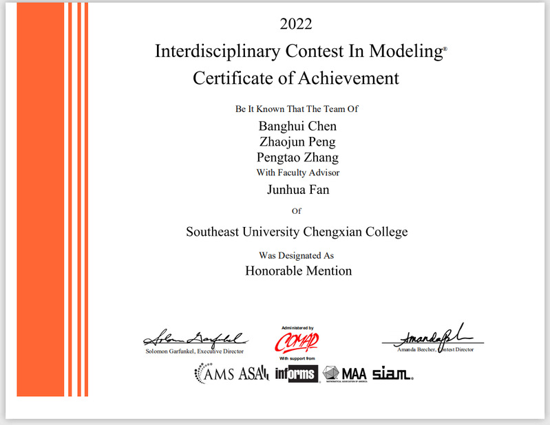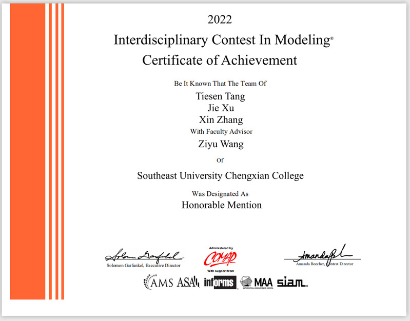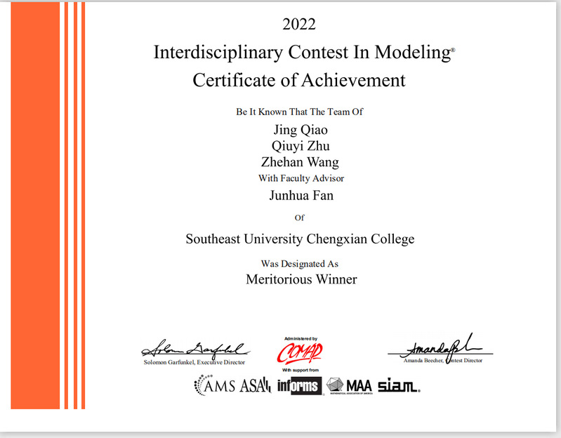 近日,2022年度第38届美国老员工数学建模竞赛(MCM/ICM)获奖结果公布。云顶国际vip.888在本届竞赛中取得优异成绩,云顶国际vip.8882名同学荣获国际一等奖(Meritorious Winner),5名同学荣获国际二等奖(Honorable Mention),打破了全院乃至全校在该项竞赛中的最高获奖纪录,在江苏省同类高校中名列前茅。