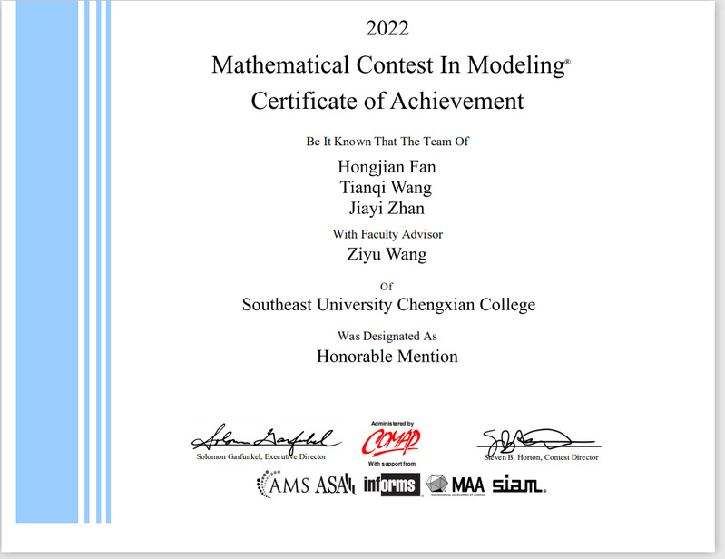 美国老员工数学建模竞赛(MCM/ICM)由美国数学及其应用联合会主办,是最高水平的国际性数学建模竞赛,在世界范围内极具影响力。赛题内容涉及经济、管理、环境、资源、生态、医学、安全等多领域。竞赛要求三人为一组,在四天时间内,就指定的问题完成从建立模型、求解、验证到论文撰写的全部工作,全面考察员工的数学基本功、计算机编程能力和英语论文写作能力,以及研究问题和解决方案的能力。每年吸引多个国家和地区的高校学子报名参加。本届比赛,全球共有27205支参赛队伍,其中国际一等奖(Meritorious Winner)获奖比例仅占所有参赛队伍的6.6%,国际二等奖(Honorable Mention)占所有参赛队伍的21.3%。